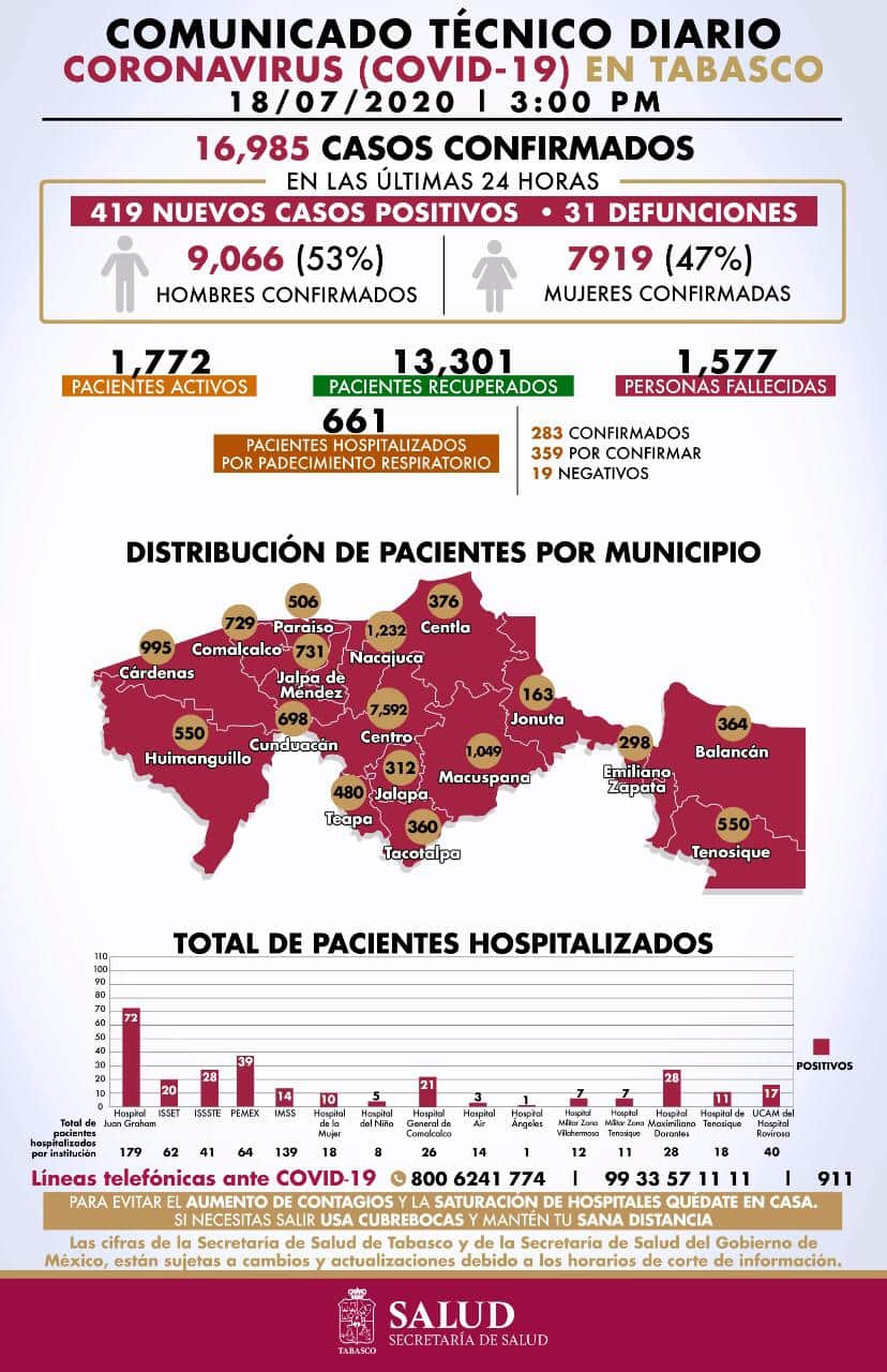 En general, Tabasco reporta 16,985 casos positivos, 13,301 pacientes recuperados y 1,577 personas fallecidas, al corte del 18 de julio.