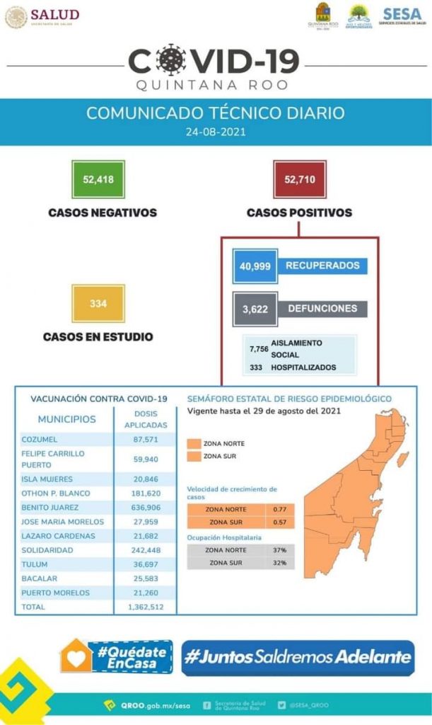 Cancún, Q. Roo, Martes 24 de Agosto de 2021, poderycrítica.- Este martes la Secretaría de Salud estatal reportó el surgimiento de 224 nuevos casos de COVID-19 y el fallecimiento de 11 personas más.