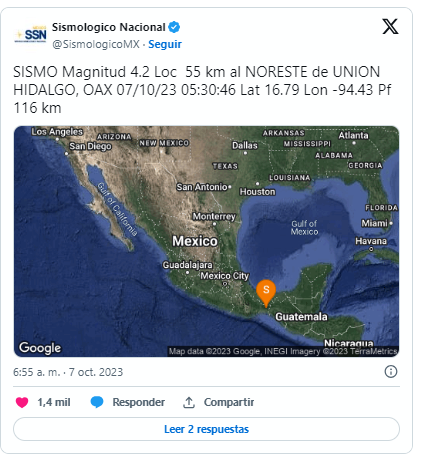Datos del Servicio Sismológico Nacional (SSN) señalan que el sismo fue de magnitud 4.2 localizado a 55 kilómetros al noreste de Unión Hidalgo, fue registrado a las 5:30 de la mañana.