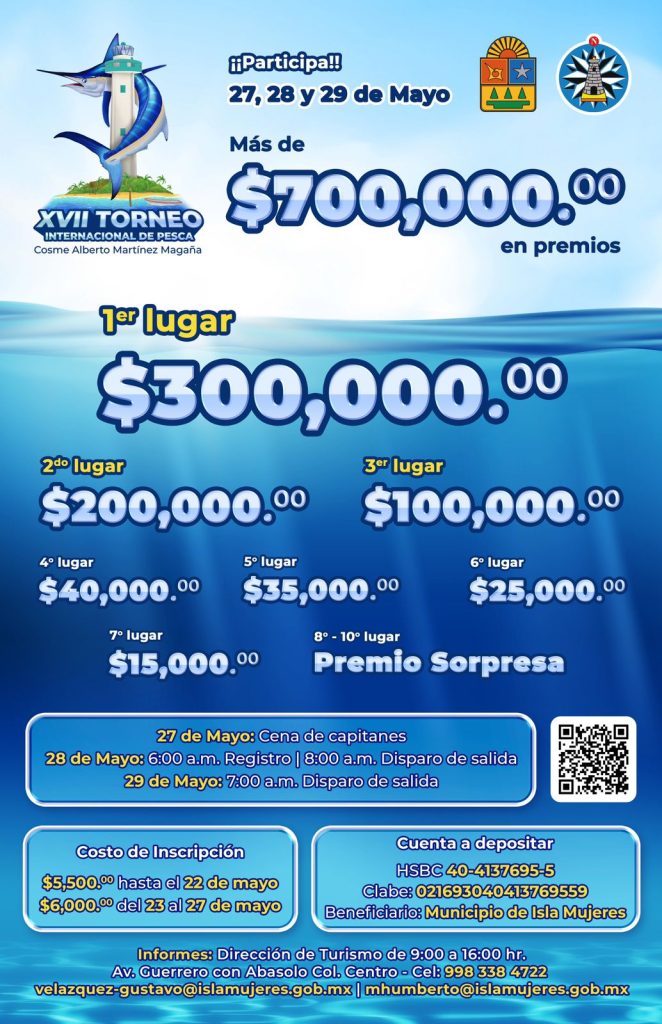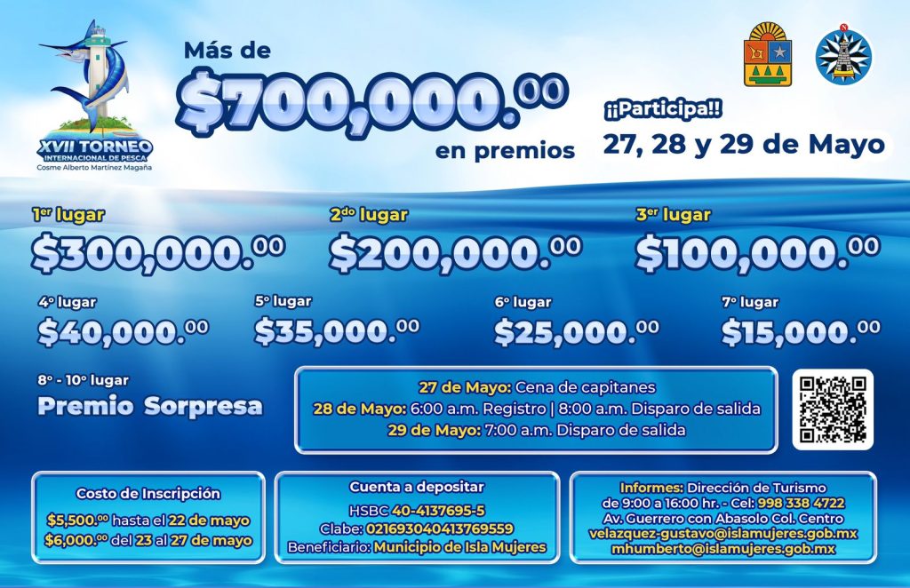 PODER Y CRÍTICA | REDACCIÓN | El XVII Torneo Internacional de Pesca «Cosme Alberto Martínez Magaña», en Isla Mujeres, se llevará a cabo del 27 al 29 de mayo. Luego de que debido al mal tiempo previsto para el próximo fin de semana, los organizadores eran postergar la fecha, se confirmó hoy que sólo se corre una semana los días.