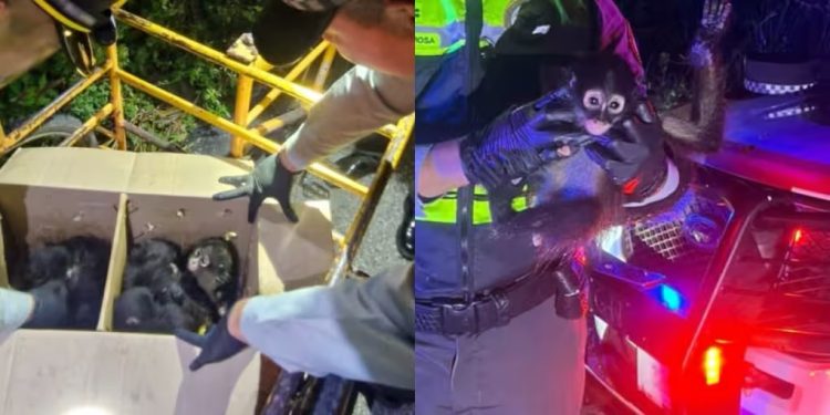 La Guardia Nacional rescató a nueve monos araña (Ateles geoffroyi) en la carretera Díaz Ordaz-Entronque Sabancuy, Campeche, cuando eran trasladados en un triciclo con intención de ser comercializados ilegalmente. Los monos fueron encontrados en una caja de cartón en condiciones de hacinamiento.