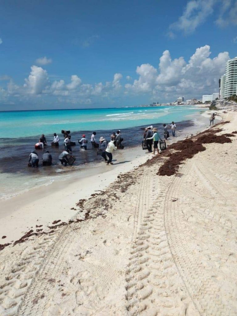 «Una gran labor, de nuestra brigada de limpieza de playas de la secretaría Mñmunicipal de Obras Y Servicios Públicos Benito Juárez, al retirar un recale de una nueva alga que no es sargazo ni pasto marino.