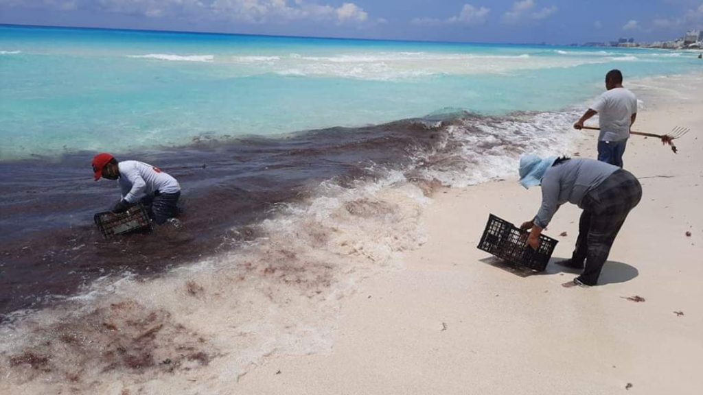 Cancún, Q. Roo, Sábado 13 de Junio de 2020, poderycrítica.- Un nuevo tipo de alga Marina fue retirada esta mañana en algunas playas de Cancún.