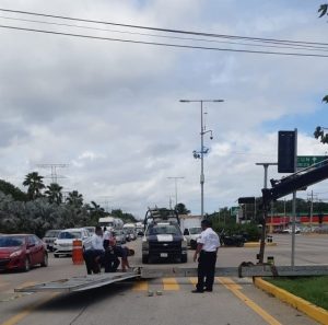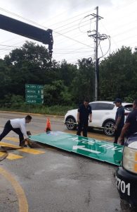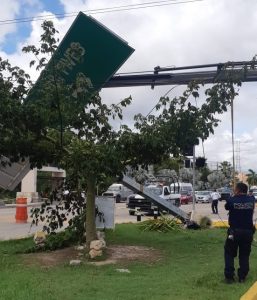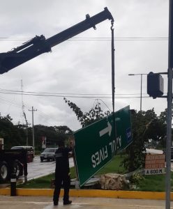 Playa del Carmen, Q. Roo, Lunes 05 de Octubre del 2020, poderycrítica.- Como parte de las tareas de prevención por los efectos de la tormenta tropical «Gamma», elementos de la dirección de Tránsito Municipal removieron una señal de bandera que estaba a punto de caer sobre el bulevar Playa del Carmen y la avenida Xcalacoco.