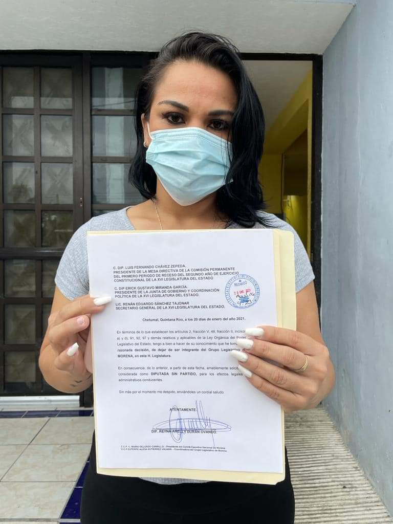 Chetumal, Q. Roo, Miércoles 20 de enero de 2021, poderycrítica.- La diputada local, Reyna Arelly Duran Ovando; renunció a la bancada de Morena y se denominó Independiente por el periodo que le resta en esta XVI Legislatura del Congreso del Estado de Quintana Roo.