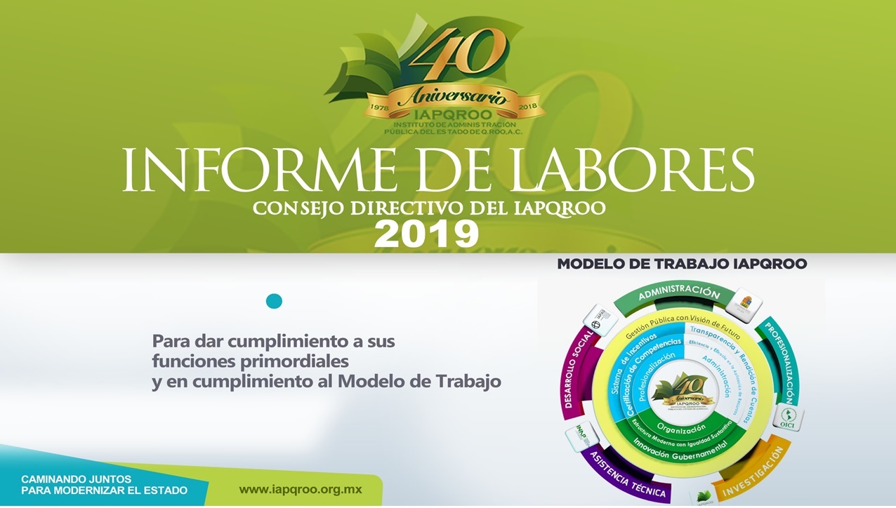 El informe 2019 se rindió para dar cumplimiento a las funciones primordiales del IAPQROO y en cumplimiento al modelo de trabajo donde se incluye la administración, la profesionalización, la investigación, la asistencia técnica y el desarrollo social.