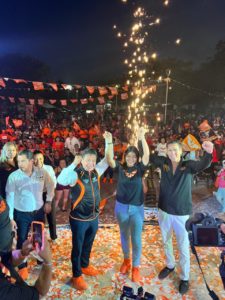 Entre porras, bailes y algarabía el abanderado naranja estuvo siempre arropado por su militancia, mientras el grupo de banda «La Poderosa” de Roly López amenizaba una caminata con rumbo a la explanada principal del lugar. La Plaza Cívica «Durango” fue el escenario donde Roberto Palazuelos emitió su último discurso como candidato al senado, dirigiéndose a los quintanarroenses que lo apoyaron en estos 90 días de campaña.