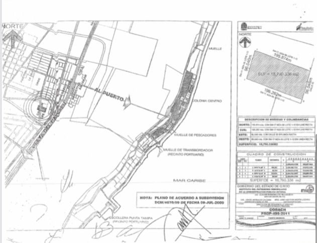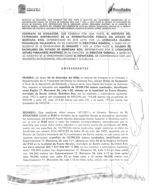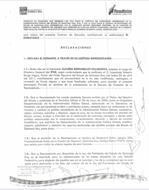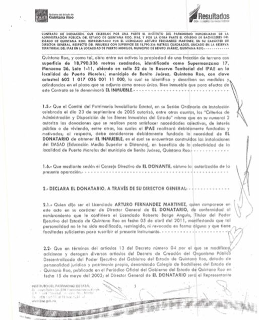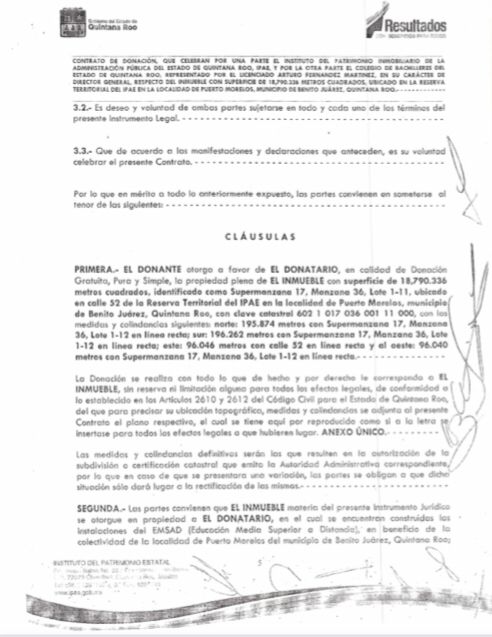 En la cláusulas de la donación se lee: EL DONANTE otorga a favor de EL DONATARIO, en calidad de Donación Gratuito, Puro y Simple, la propiedad plena de EL INMUEBLE con superficie de 18,790.336 metros cuadrados, identificado como Supermanzana 17, Manzana 36, Lote 1-11, ubicado en calle 52 de la Reserva Territorial del IPAE en la localidad de Puerto Morelos, municipio de Benito Juárez, Quintana Roo, con clave catastral 602 1 017 036 001 11 000, con las medidas y colindancias siguientes, al norte: 195.874 metros con Supermanzana 17, Manzana 36, Lote 1-12 en línea recta; sur: 196.262 metros con Supermanzana 17, Manzana 36, Lote 1-12 en línea recta; este: 96.046 metres con calle 52 en línea recta y el oeste: 96.040 metres can Supermanzana 17, Manzana 36, Lote 1-12.