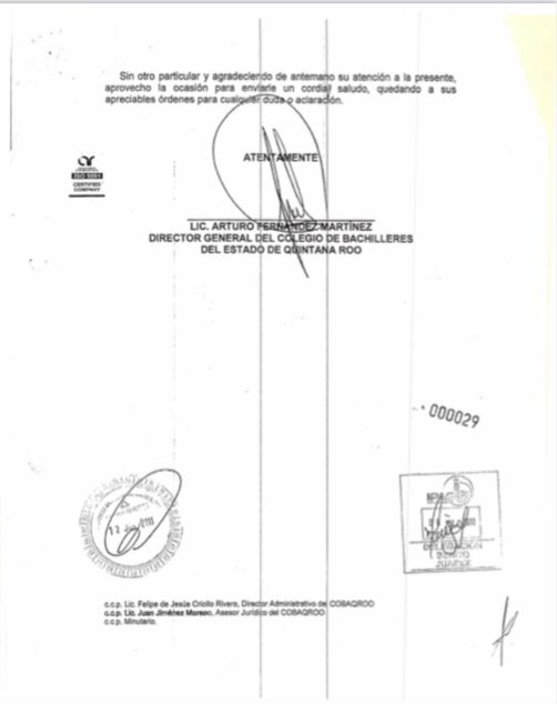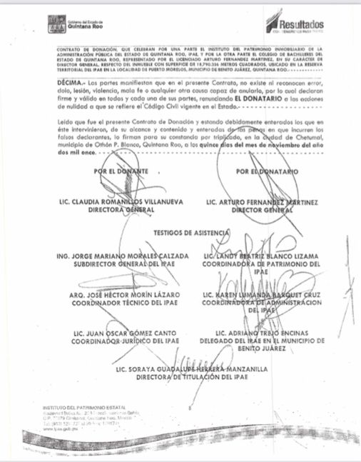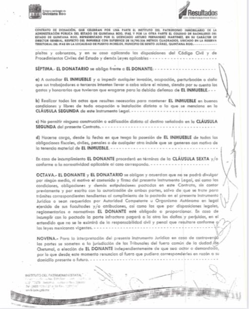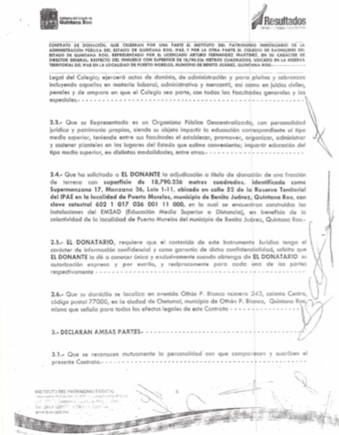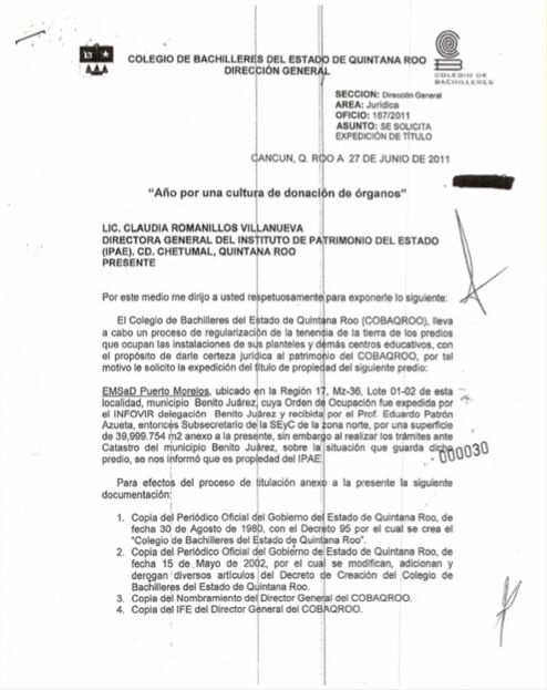 Ante tales irregularidades y de que lo estipulado en metros en la posesión otorgada y la donación regulada, el 27 de junio De 2011 en un escrito del director general del Colegio de Bachilleres de Quintana Roo, Arturo Fernández Martínez dirigido a Claudia Romanillos Villanueva en su calidad de Directora General del Instituto del Patrimonio del Estado (IPAE) le informa: