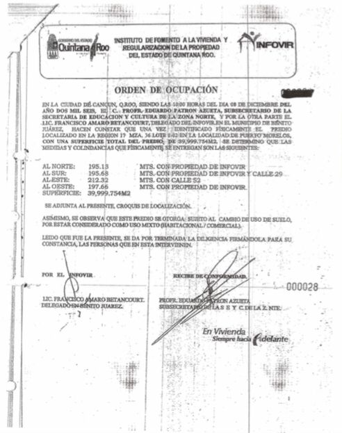 Todo inicia el 8 de diciembre de 2006 cuando el Instituto de Fomento la Vivienda y Regularización de la Propiedad del Estado de Quintana Roo, otorgó Orden de Ocupación a favor de la Secretaria de Educación y Cultura de la Zona Norte del Estado de Quintana Roo, respecto al inmueble con superficie de 39,999.754 metros cuadrados, identificado como Región 17, Manzana 36, Lote 1-02, ubicado en la localidad de Puerto Morelos, municipio de Benito Juárez, Quintana Roo, con las medidas y colindancias siguientes norte: 195.13 metros con propiedad de INFOVIR; son 195.68 metros con propiedad de INFOVIR y calle 29, este: 212.32 metros con calle 52, y al oeste: 197.66 metros con propiedad de INFOVIR.