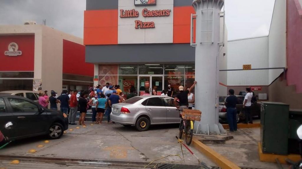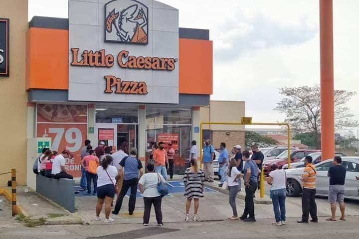 Una pizzería (Little Cesar’s) que no maneja entrega a domicilio, aunque sus productos pueden llegar a través de distintas plataformas a domicilio, ofreció precios especiales de tal manera que la gente hizo monumentales filas para poder adquirir el artículo.