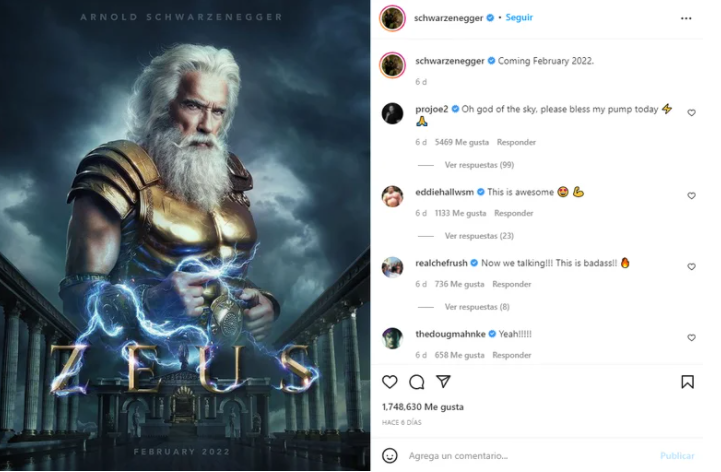 Por otro lado, durante la última semana de enero, la importante marca de autos BMW confirmó a través de Instagram que se trata de un comercial en el que participará también Arnold Schwarzenegger. Fue hace unos días que el también histrión y político estadounidense, compartió con sus más de 22 millones de seguidores una fotografía personificado como Zeus, en su cuenta de Instagram.