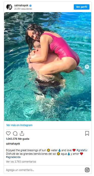 En las fotos, Hayek posa en una piscina con un escotado bañador fucsia de una pieza, saltando sobre la espalda de su marido de 61 años en una foto y dando a los fans una visión más cercana de su sexy traje en otras dos.