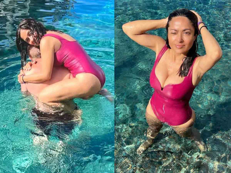 En las fotos, Hayek posa en una piscina con un escotado bañador fucsia de una pieza, saltando sobre la espalda de su marido de 61 años en una foto y dando a los fans una visión más cercana de su sexy traje en otras dos.
