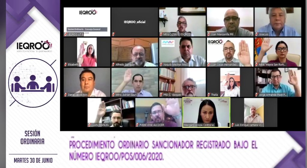 Chetumal, Q. Roo, Martes 30 de Junio de 2020, poderycrítica. – El Consejo General del Instituto Electoral de Quintana Roo (IEQROO), en Sesión Ordinaria aprobó proyectos de resolución de procedimientos ordinarios sancionadores; se aprobó una resolución de queja; se dio respuesta al escrito presentado por el Secretario General del PVEM; se aprobó las medidas para la atención y sustanciación de los procedimientos administrativos sancionadores locales y medidas cautelares derivados del retorno ordenado, gradual y escalonado a las actividades presenciales, ante la pandemia generada por el virus SARS-CoV 2 (COVID-19); y el informe de los procedimientos de adjudicación tramitados a través del Comité de Contrataciones, Adquisiciones y Bajas del Instituto del 14 de febrero al 24 de junio de 2020.