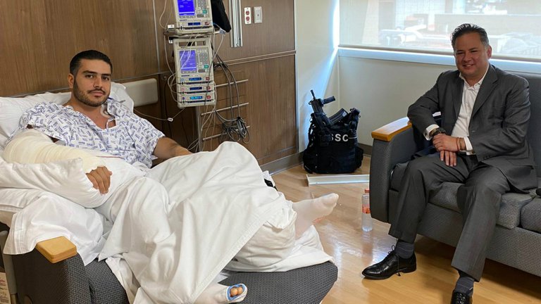García Harfuch recibió tres impactos de arma de fuego y, derivado de estas lesiones, fue intervenido quirúrgicamente. Ahora, el secretario de seguridad capitalina está fuera de peligro y, como parte del proceso de recuperación postoperatorio, no puede mover su brazo y pierna; sin embargo, a menos de dos metros de distancia, el hijo de Javier García Paniagua, ex titular de la extinta Dirección Federal de Seguridad, mantiene un chaleco antibalas y un fusil de asalto.
