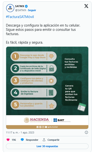 “Con el objetivo de facilitar el proceso para que los contribuyentes puedan cumplir con sus obligaciones fiscales, el Servicio de Administración Tributaria (SAT) lanza Factura SAT Móvil, una aplicación gratuita para dispositivos móviles que permite generar y enviar facturas de ingreso versión 4.0, además de consultarlas de manera fácil, rápida y segura”, señaló el SAT en un comunicado.