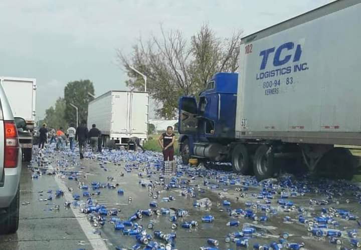Querétaro, Querétaro, Sábado 26 de septiembre de 2020, poderycrítica.-. Un tráiler cargado de cervezas Bud Ligth sufrió un accidente en la carretera México-Querétaro, a la altura de Loma Linda en San Juan Del Río.