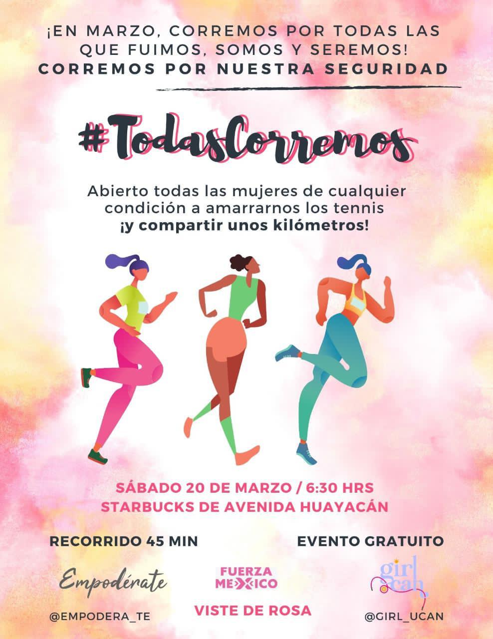 Teniendo como eslogan “En marzo, corremos por todas las que fuimos, somos y seremos, corremos por nuestra seguridad”, decenas de mujeres correrán sobre la avenida Huayacán, en un evento que será totalmente gratuito. La cita es este sábado 20 de marzo a las 6:30 de la mañana y que tendrá como punto de partida el Starbucks de la avenida Huayacán.
