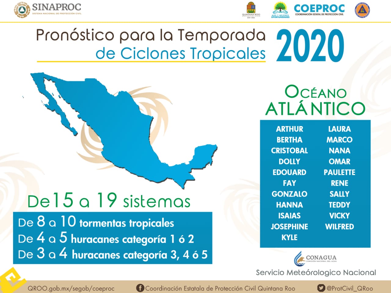 El Servicio Meteorológico Nacional (SMN) informó que se tendrá una temporada de ciclones muy activa en el Atlántico, Mar Caribe y Golfo de México del 1 de junio al 30 de noviembre, con una estimación de 19 fenómenos.
