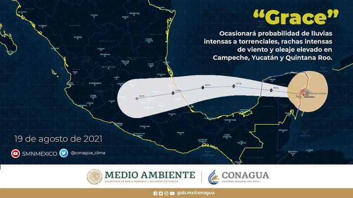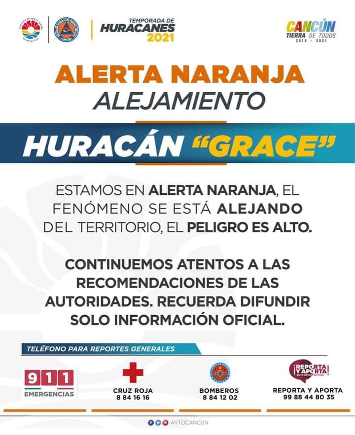 Cancún, Quintana Roo, jueves 19 de agosto del 2021, poderycritica.- Se emite Alerta Naranja (Peligro Alto), pues el huracán Grace ya se encuentra alejándose.