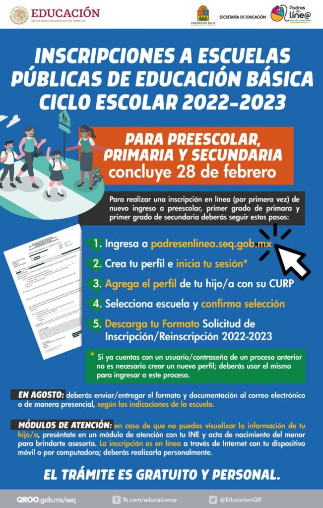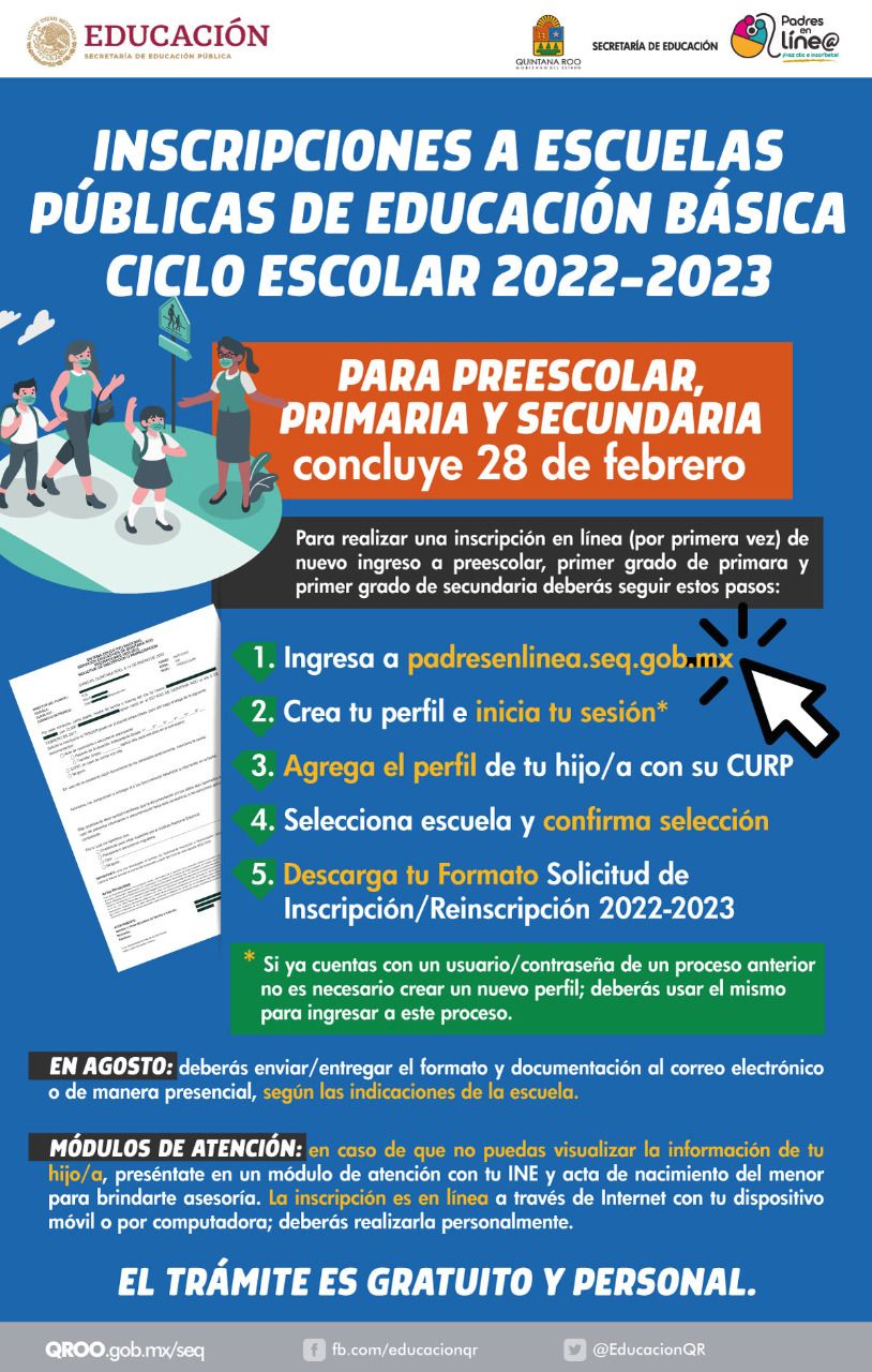 El registro de solicitud de inscripción se realiza vía Internet a través de la página web: https://padresenlinea.seq.gob.mx/. Una vez realizada la inscripción se descarga el formato de “Solicitud de Inscripción o Reinscripción”, el cual se deberá enviar con la documentación establecida en el mismo, al correo de la escuela a partir del inicio del ciclo escolar 2022-2023 del año en curso.