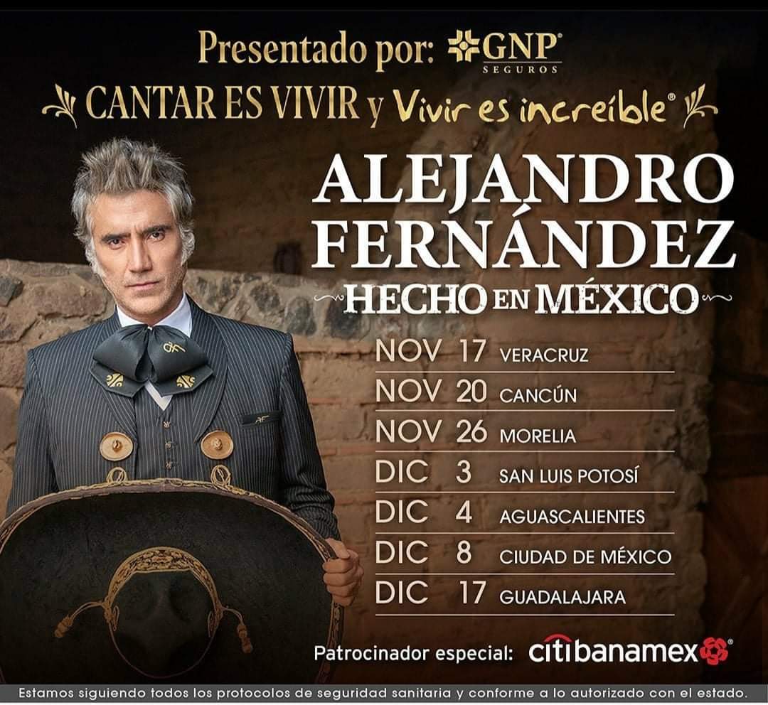Cancún, Q. Roo, martes 28 de septiembre de 2021, poderycrítica.- Por medio de las redes sociales se dieron a conocer las fechas para los próximos conciertos de Alejandro Fernández, en donde por supuesto entra la ciudad de Cancún.