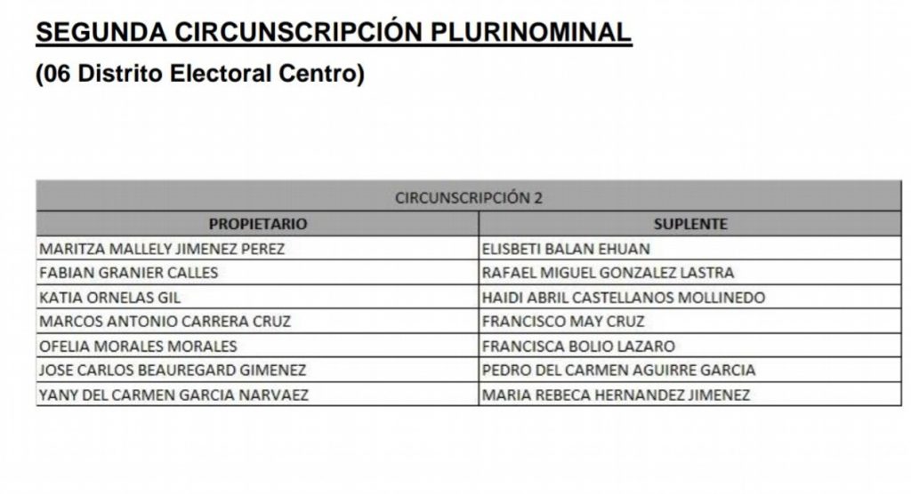 El delegado político del Comité Ejecutivo Nacional en Campeche, Erubiel Lorenzo Alonso Que, figura en la segunda posición de la primera circunscripción, seguido de María Inés de la Fuente Dagdug, presidenta del Organismo Nacional de Mujeres Priistas (ONMPRI).
