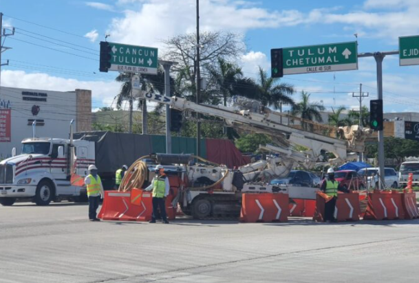 Playa del Carmen, Q. Roo, viernes 12 de noviembre de 2021, poderycrítica.- Esta mañana, una grúa utilizada en la construcción del Tren Maya sufrió falla mecánica en pleno cruce vial del bulevar Playa del Carmen con la calle 41 Sur.