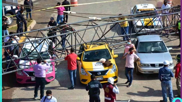 Tabasco, 17 septiembre; poderycritica.-Se desplomó una grúa en los trabajos de construcción del distribuidor vial de Universidad sobre cuatro vehículos; se reportan dos personas lesionadas.