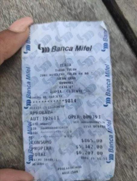 La usuaria expresó que el mesero cobró una propina de 5 mil 342 pesos cuando apenas su consumo fue de solo 865 pesos y el total del ticket era de 6 mil 207 pesos, sin embargo la usuaria no se dio cuenta del gasto hasta el día siguiente.