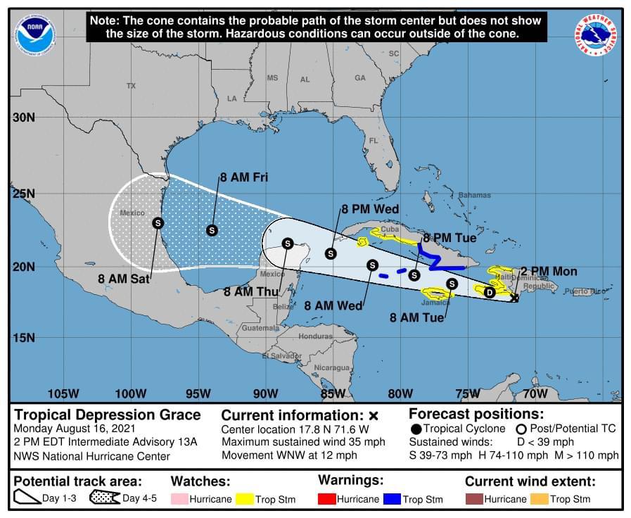 Previo a este anuncio, comentó que la depresión tropical “Grace” se ubica a 1,660 kilómetros al este de las costas de Quintana Roo, presenta vientos máximos sostenidos de 55 km/h, rachas de 75 km/h y desplazamiento hacia el Oeste a 24 km/h. se vigila constantemente.