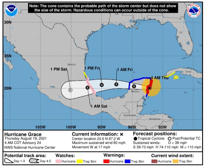 Cancún, Quintana Roo, jueves 19 de agosto del 2021, poderycritica.- Se espera que el huracán «Grace» de categoría 1, pierda fuerza en su trayectoria a Yucatán, según el Servicio Meteorológico Nacional (SMN).