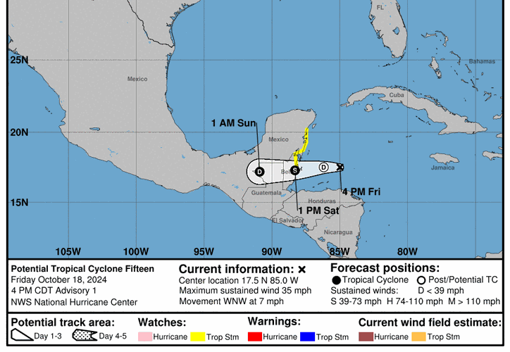 PODER Y CRÍTICA | REDACCIÓN | El Centro Nacional de Huracanes de Miami (NOAA), Estados Unidos, lanzó el primer avisó sobre el Potencial Ciclón número 15 en el mar Caribe, mismo que se prevé traiga fuerte lluvias en Quintana Roo y Belice.