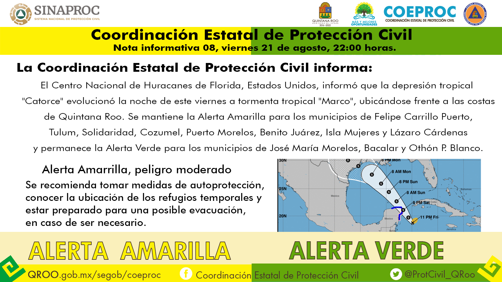 Chetumal, agosto 21.- Esta noche, la depresión tropical número 14 evolucionó a tormenta tropical llamada Marco.