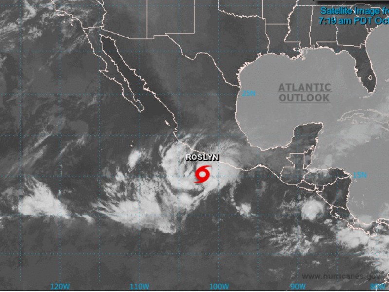 Roslyn se localiza a 280 kilómetros al sur de Zihuatanejo, Guerrero, y a 490 kilómetros al sur este de Manzanillo, Colima, con vientos máximos sostenidos de 65 km/h. Se desplaza al oeste a 9 km/h.