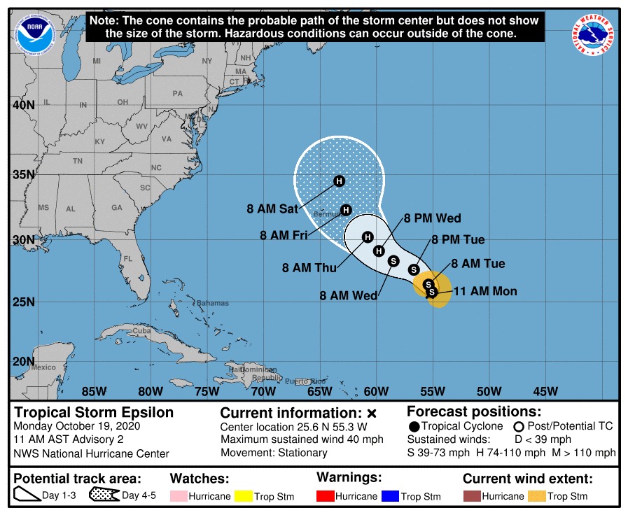 “El Centro Nacional de Huracanes de Miami, Florida, Estados Unidos, por la mañana de este lunes, informó de la formación de la depresión tropical número “Veintisiete”, la cual más tarde evolucionó a tormenta tropical Épsilon del océano Atlántico, ubicándose a las 10:00 horas su centro a 3,250 kilómetros al este noreste de las costas de Quintana Roo. Presenta vientos máximos sostenidos de 65 kilómetros por hora, rachas de 85 kilómetros por hora y se mantiene estacionaria.