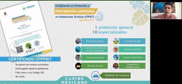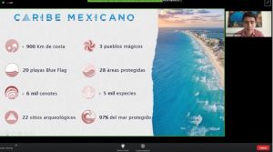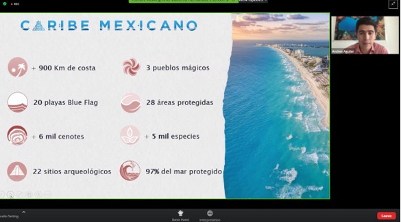 Igualmente se llevó a cabo la presentación “Caribe Mexicano, un Destino seguro del Mundo Maya”, por parte del Subsecretario de Promoción y Operación Turística y Encargado de Despacho, el Mtro. Andrés Aguilar Becerril, quien abordó los diferentes mecanismos que el estado de Quintana Roo ha implementado, desde el inicio de la pandemia, para salvaguardar la salud y bienestar de la población y los millones de turistas y visitantes, como son los programas de: Certificación en Protección y Prevención en Instalaciones Turísticas y el Guest Assist. Destacó el incremento en la conectividad aérea hacia el Caribe Mexicano, y la afluencia de la temporada vacacional de verano.