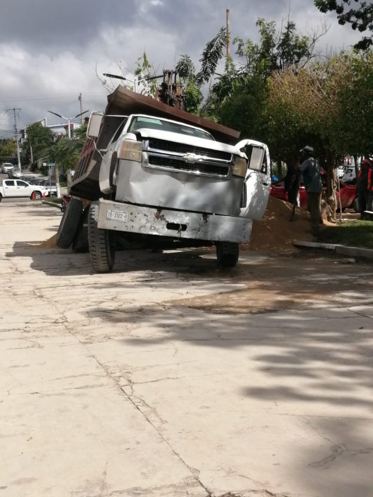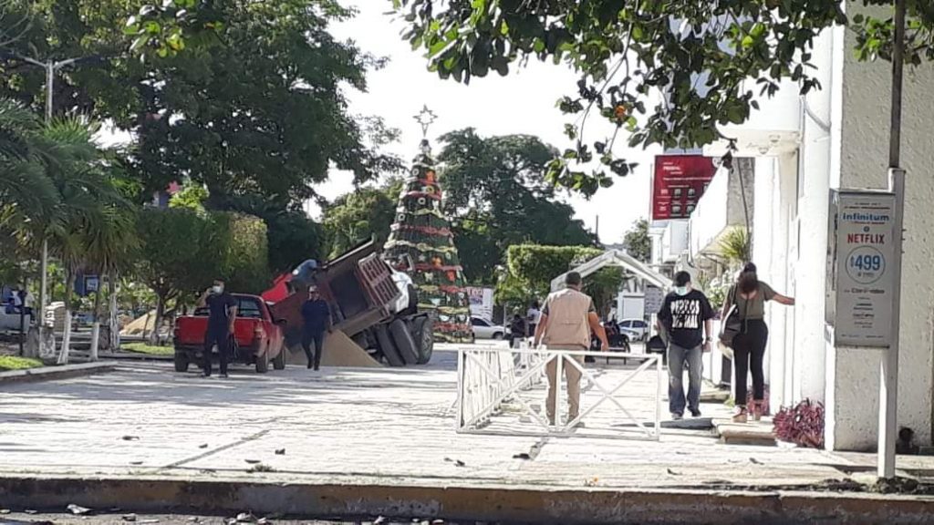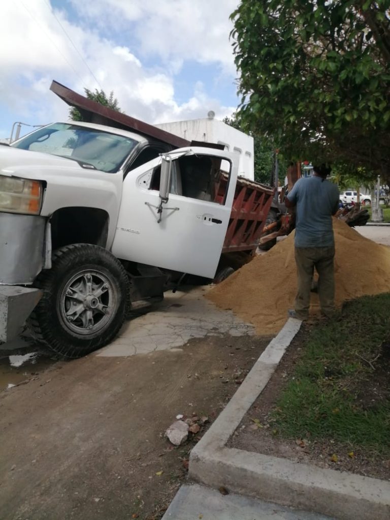 Chetumal, Q. Roo, Martes 22 de Diciembre de 2020, poderycrítica.- Una unidad de volteo quedó hundida en un socavón, luego de desfondarse el piso del parque de La Alameda de Chetumal que está siendo rehabilitado por María Andrea Segovia Díaz, hija del alcalde Othón P. Blanco, Otoniel Segovia Martínez.