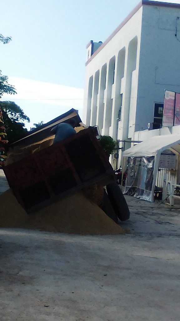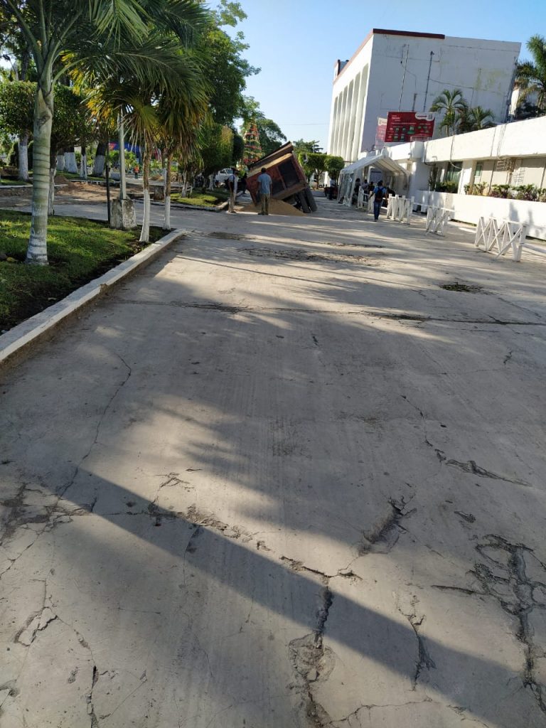 La unidad de volteo transportaba una carga de polvo que sería utilizado para continuar con estos trabajados de remodelación de este espacio público.