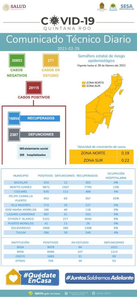 Así el municipio de Puerto Morelos tuvo un 100 por ciento de disminución en el número de casos Covid-19, en José María Morelos también hay una disminución del 100 por ciento, en el caso del municipio de Isla mujeres también tuvo un 100 por ciento de descenso del número de casos de Covid-19, el municipio de Cozumel registro un 73 por ciento de disminución, en el caso de Solidaridad hay una disminución del 37 por ciento pero a la alza, en Othón P. Blanco hay un 31 por ciento de disminución general, en Benito Juárez hay un aumento del 02 por ciento y a la alza, en el municipio de Lázaro Cárdenas hay un aumento del 06 por ciento y a la alza, en el municipio de Felipe Carrillo Puerto hay un aumento del 10 por ciento con índices a la alza, en el caso del municipio de Tulum hay una alza de casos del 16 por ciento y repuntando, en tanto que el municipio de Bacalar hay un aumento del 27 por ciento y a la alza.
