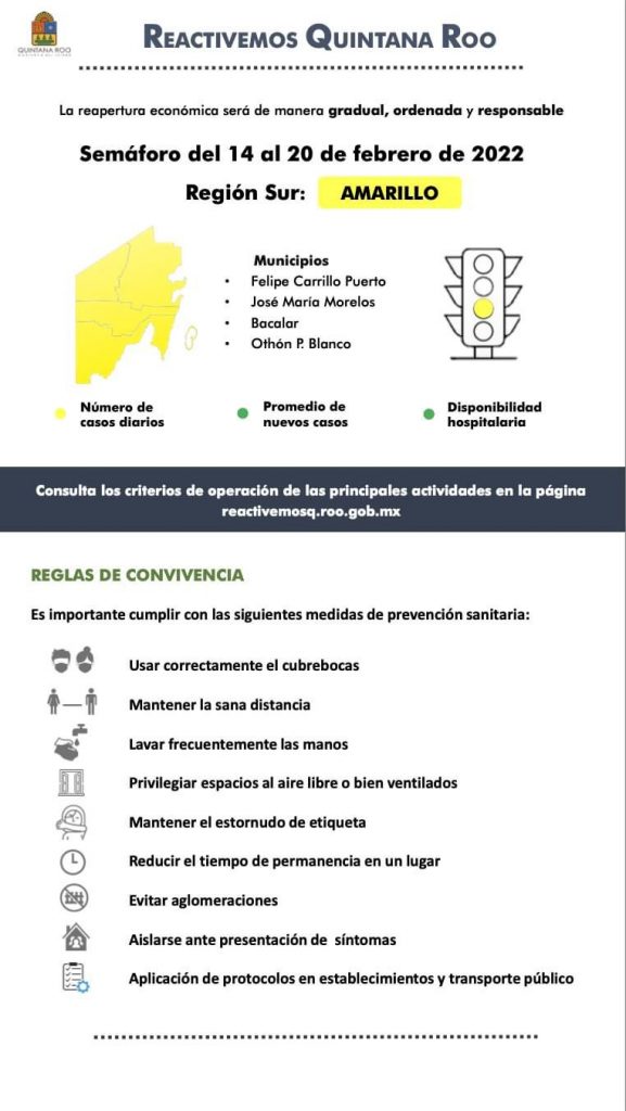 PODER Y CRÍTICA | SAMUEL CAAMAL | Autoridades del gobierno del estado dieron a conocer que del 14 al 20 de Febrero se mantendrá el color amarillo en el semáforo epistemológico en el norte y sur del estado. Se hizo énfasis en el reforzamiento de la tercera dosis de vacunación para evitar riesgos en la salud ante el COVID-19.