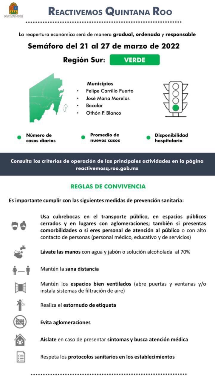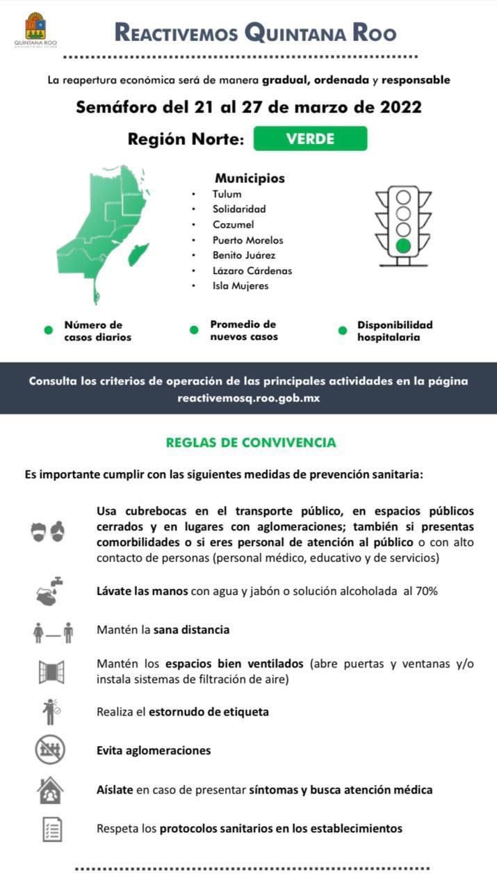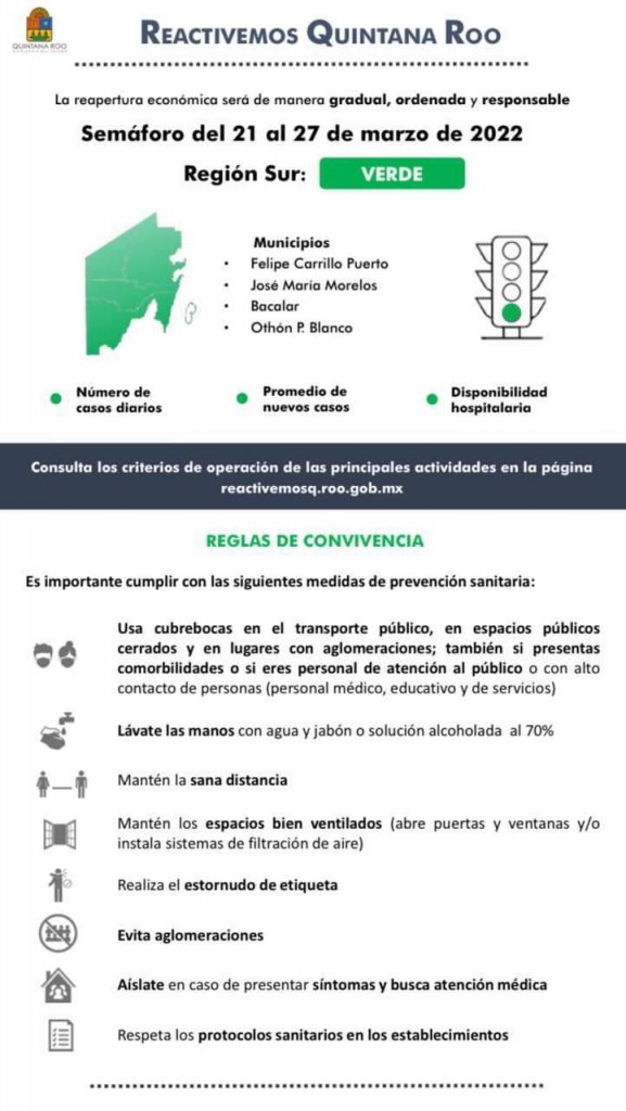 El gobernador Carlos Joaquín González informó que este semáforo aplicará para los once municipios de Quintana Roo y estará vigente del 21 al 27 de marzo.