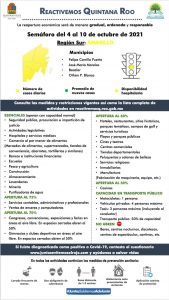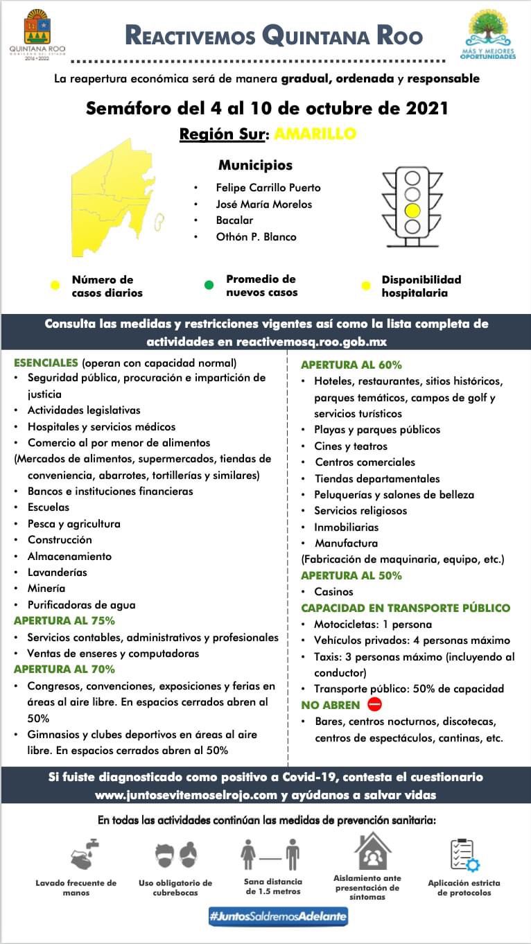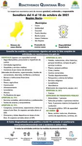 Chetumal, Q. Roo, Viernes 01 de Octubre de 2021, poderycrítica.- El gobernador del estado Carlos Joaquín dio a conocer el semáforo epidemiológico del 4 al 10 de Octubre donde la zona norte y sur del estado se mantiene en color amarillo. Solo el municipio de Felipe Carrillo Puerto ha tenido un incremento del 79% de contagios y velocidad del COVID19.