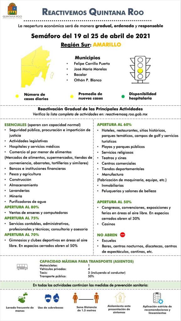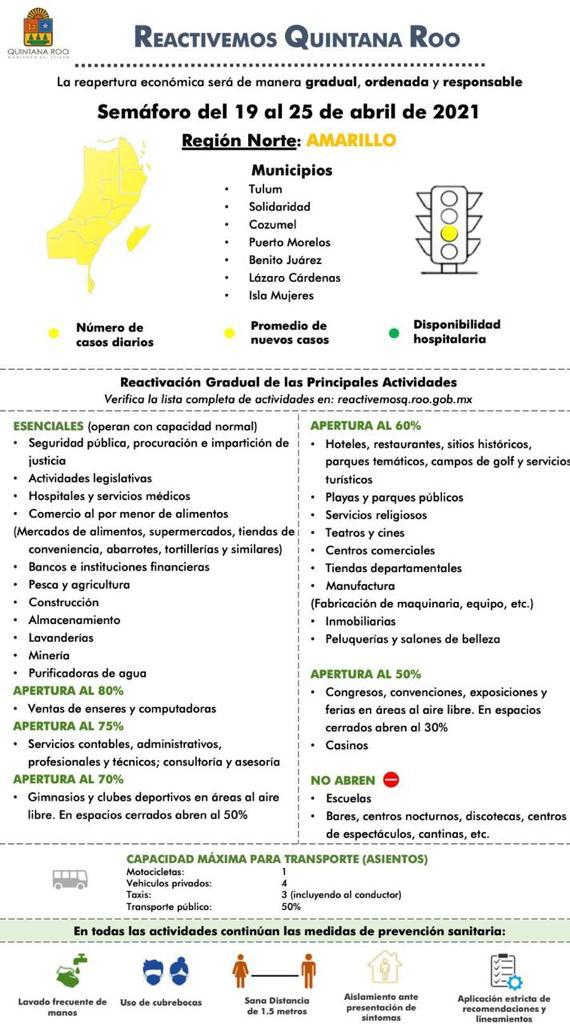 En cuanto al semáforo epidemiológico, el gobernador del estado Carlos Joaquín comentó que la región norte de Quintana Roo se mantiene en amarillo el cual estará vigente del 19 al 25 de abril y aplica para los municipios de Solidaridad, Cozumel, Isla Mujeres, Tulum, Lázaro Cárdenas, Puerto Morelos, Benito Juárez.