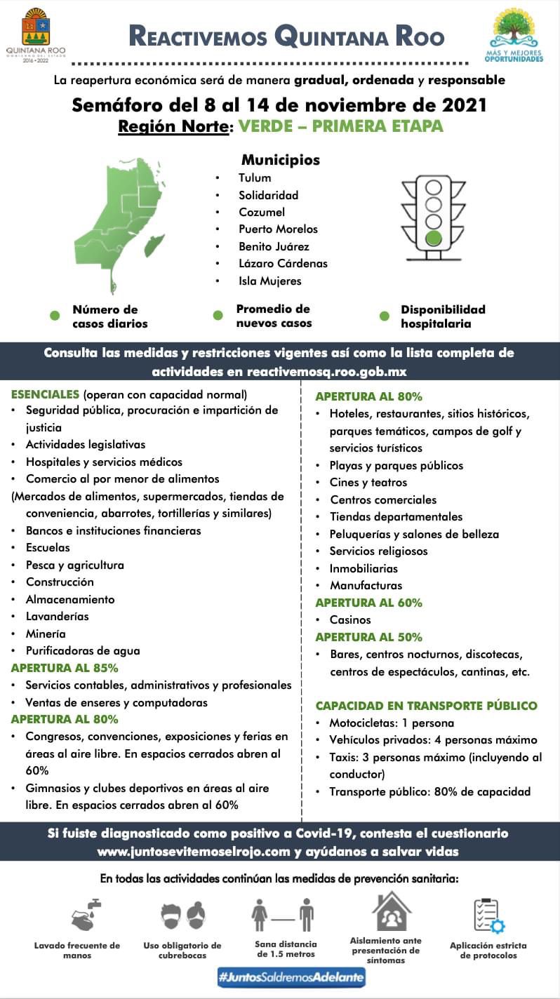 La zona norte del estado de Quintana Roo también se mantiene en semáforo epidemiológico verde en primera etapa, esta región comprende los municipios de Solidaridad, Cozumel, Isla Mujeres, Tulum, Lázaro Cárdenas, Puerto Morelos y Benito Juárez, la tasa de contagios es de 0.92 puntos, en tanto la ocupación hospitalaria disminuyo y se encuentra ahora en 7 por ciento en camas en general y del 7 por ciento en camas con ventilador.