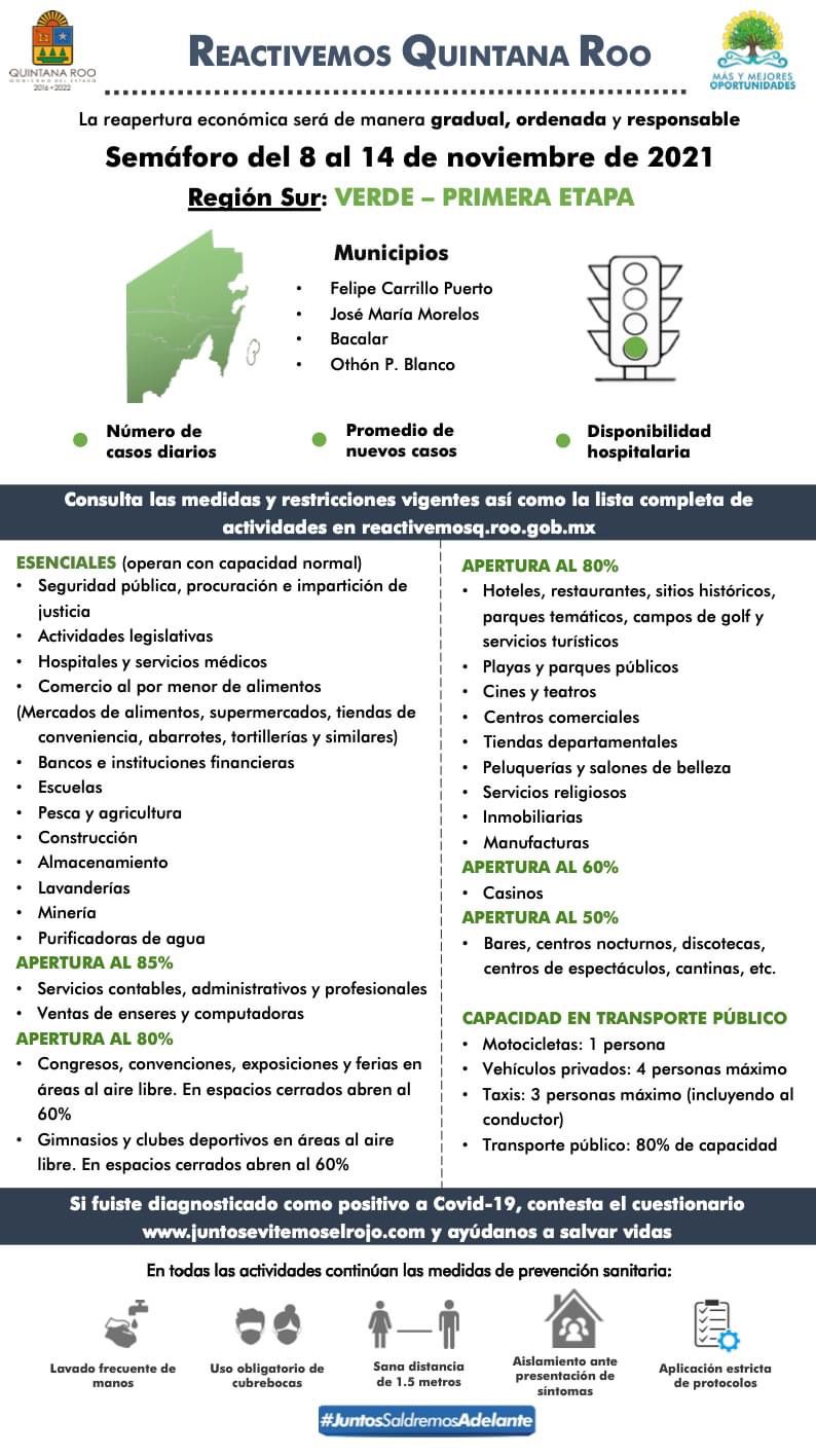 Sobre la actualización del semáforo epidemiológico en el estado, el gobernador dijo que del 8 al 14 de noviembre la región sur del estado permanece en color verde, esta zona la comprenden los municipios de los municipios de Bacalar, Othón P. Blanco, Felipe Carrillo Puerto y José María Morelos.