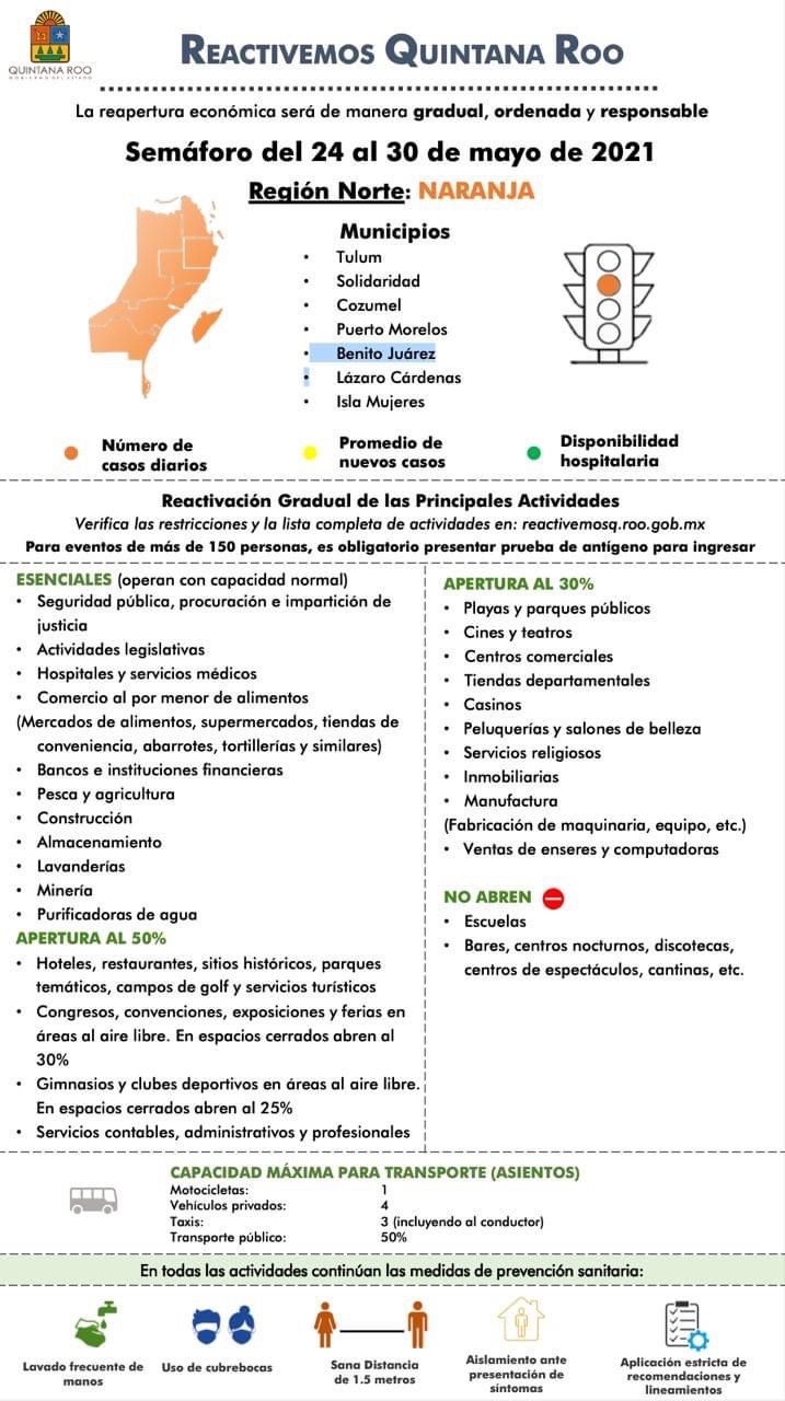 El semáforo epidemiológico para la región norte de Quintana Roo se mantiene en color naranja el cual estará vigente del 24 al 30 de mayo y aplica para los municipios de Solidaridad, Cozumel, Isla Mujeres, Tulum, Lázaro Cárdenas, Puerto Morelos, Benito Juárez. La ocupación hospitalaria pasa del 10 por ciento al 23 por ciento lo que coloca a los hospitales en semáforo naranja y acercándose al rojo, en tanto que la tasa de contagio pasa de 1.14 a 1.09 puntos, pero con una tendencia a aumentar en las siguientes dos semanas.