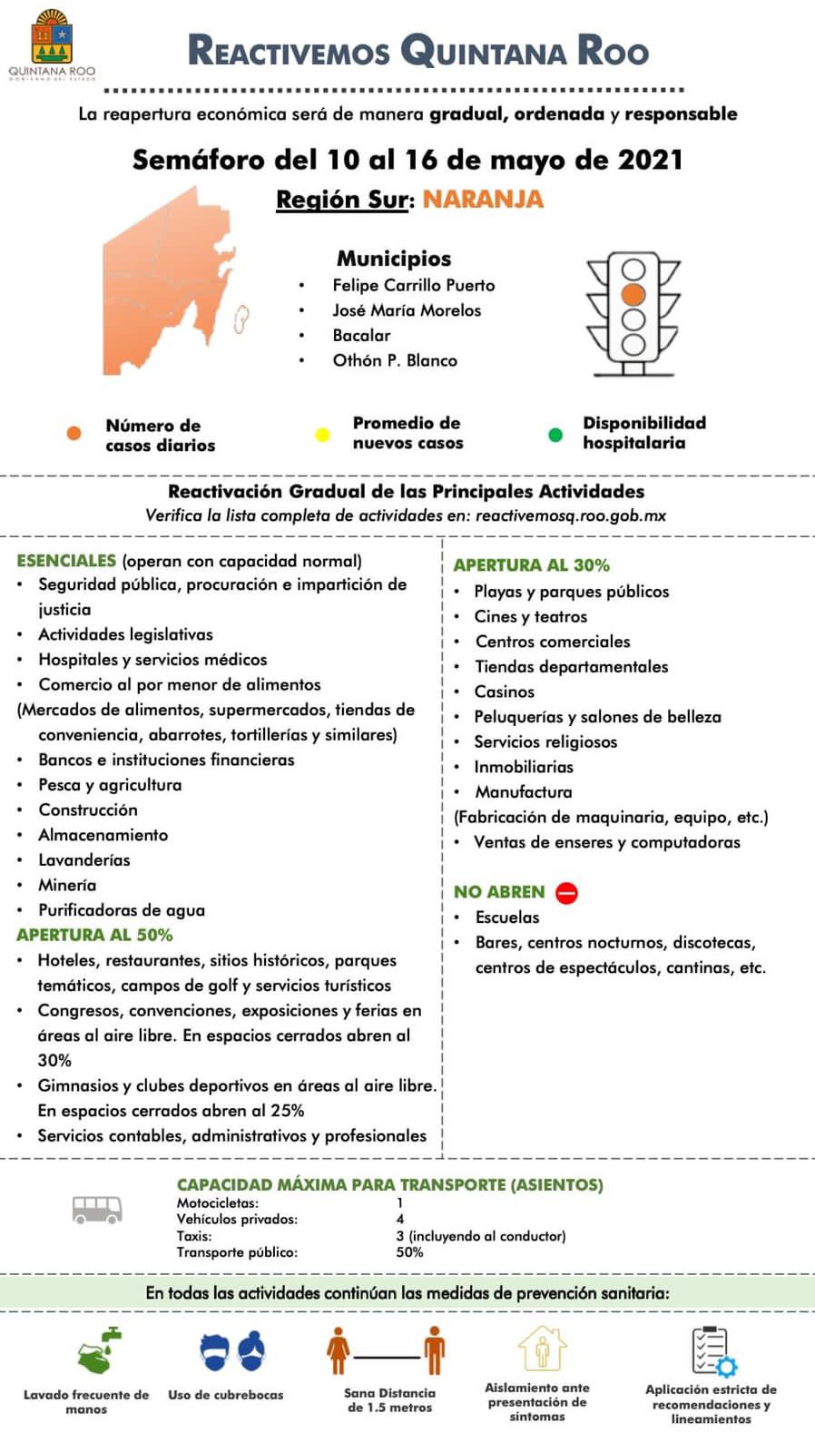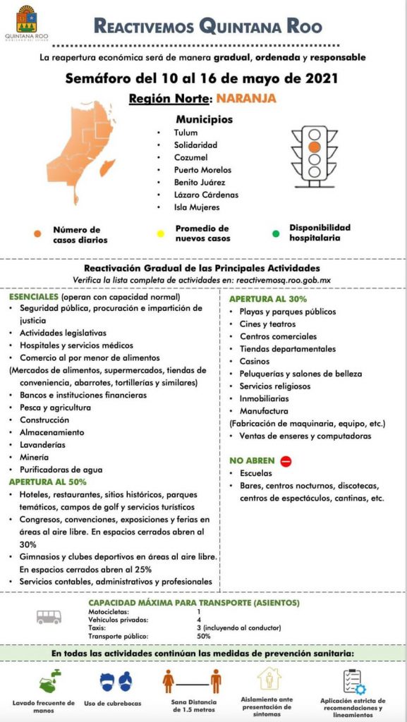 Cancún, Q. Roo, Jueves 06 de Mayo de 2021, poderycrítica.- En el semáforo epidemiológico del 10 al 16 de Mayo en Quintana Roo se informó que tanto en la zona sur como norte se mantendrá el color naranja. Las autoridades estatales advirtieron que existe la posibilidad de regresar al color rojo de no acatarse las medidas sanitarias para evitar mayores contagios.