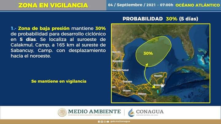 Chetumal, Quintana Roo sábado 04 de septiembre del 2021, poderycritica.- Mantenemos en vigilancia zona de Baja Presión, con 30% de probabilidad para desarrollo ciclónico en 5 días.